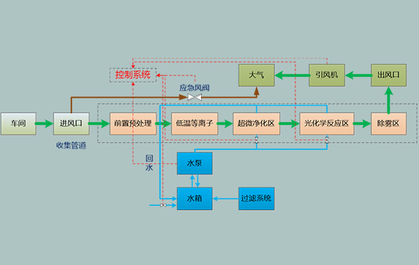 橡胶轮胎行业废气具有浓度低、气量大、成分复杂等特点,低温等离子+光化学技术在处理橡胶废气方面具有很强的综合优势。低温等离子体是继固态、液态、气态之后的物质的第四态,当外加电压达到气体的着火电压时,气体被击穿,产生包括电子、各种离子、原子和自由基在内的混合体。放电过程中虽然电子温度很高,但重粒子温度很低,整个体系呈现低温状态,所以称为低温等离子体。废气首先进入低温等离子体装置,利用高能电子、自由基等活性粒子和废气中的污染物作用,使污染物分子在极短的时间内发生分解,并发生后续的各种反应以达到分解污染物的目的。在等离子体装置中,部分污染物不是完全转化为CO2、H2O等物质,而是生成短链小分子有机物或其他活性态物质,这些物质接下来再进入光化学反应设备,在紫外线和臭氧的共同作用下,被完全氧化,形成基本的CO2、H2O等无机污染物。