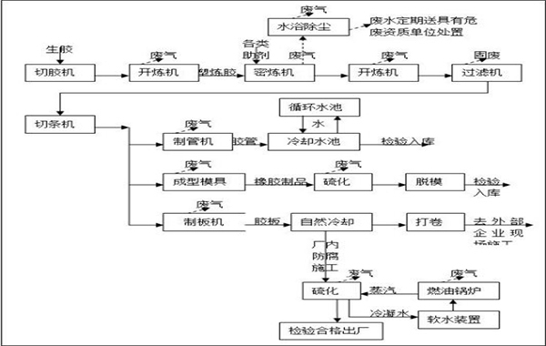 橡胶制品工业生产废气主要产生于下列工艺过程或生产装置,炼胶过程中产生的有机废气,纤维织物浸胶、烘干过程中的有机废气,压延过程中产生的有机废气,硫化工序中产生的有机废气,树脂、溶剂及其它挥发性有机物在配料、存放时产生的有机废气。橡胶制品工业生产废气中可能残存单体包括丁二烯、戊二烯、氯丁二烯、丙烯腈、苯乙烯、二异氰酸甲苯酯、丙烯酸甲酯、甲基丙烯酸甲酯、丙烯酸、氯乙烯、煤焦沥青等。